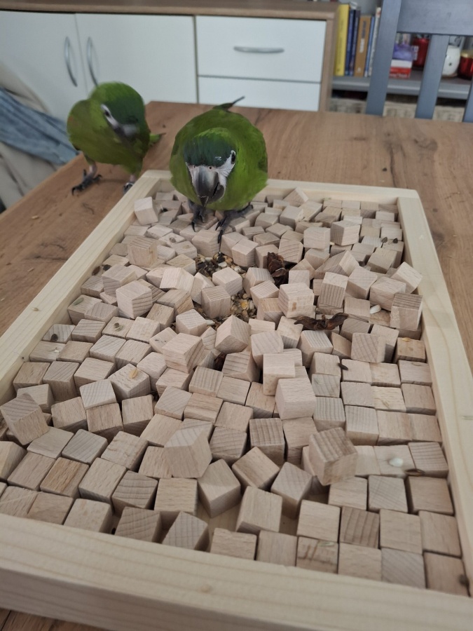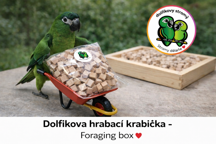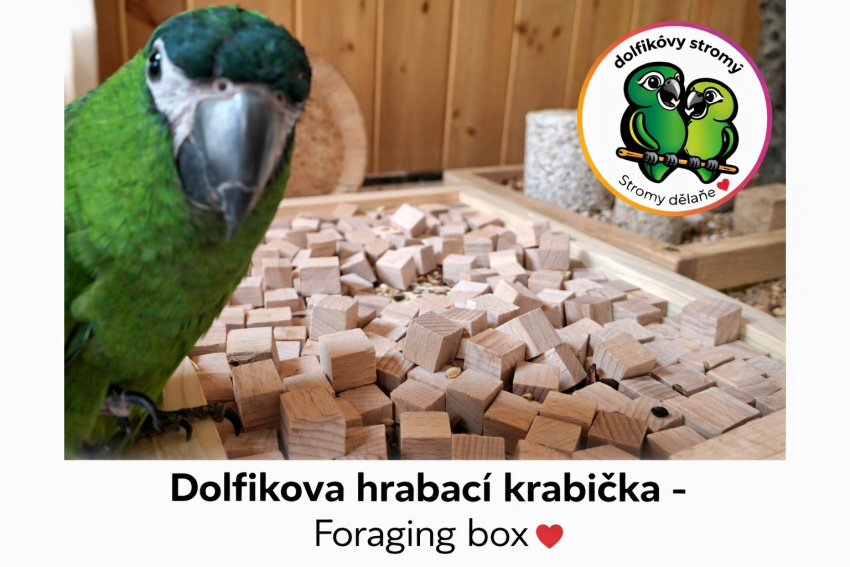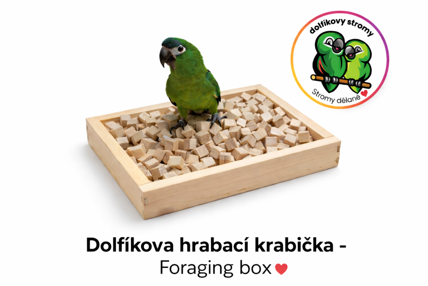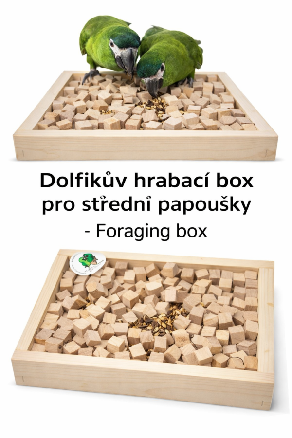 Foraging – Dolfíkův hrabací box 25 x 35 cm s kostičkami z buku o hraně 15 mm. Možno doplnit o nastřihaný papír. Určeno pro střední papoušky