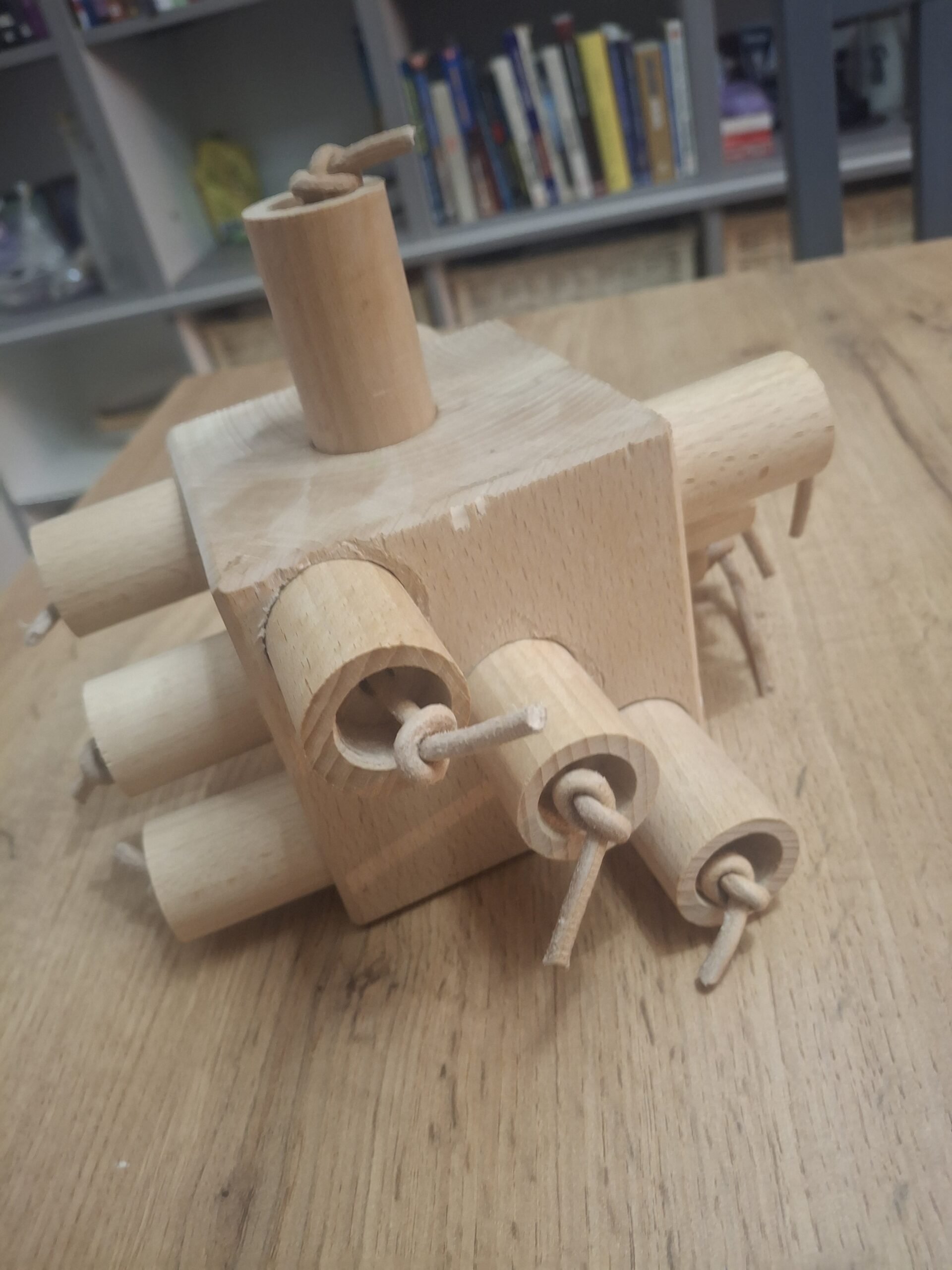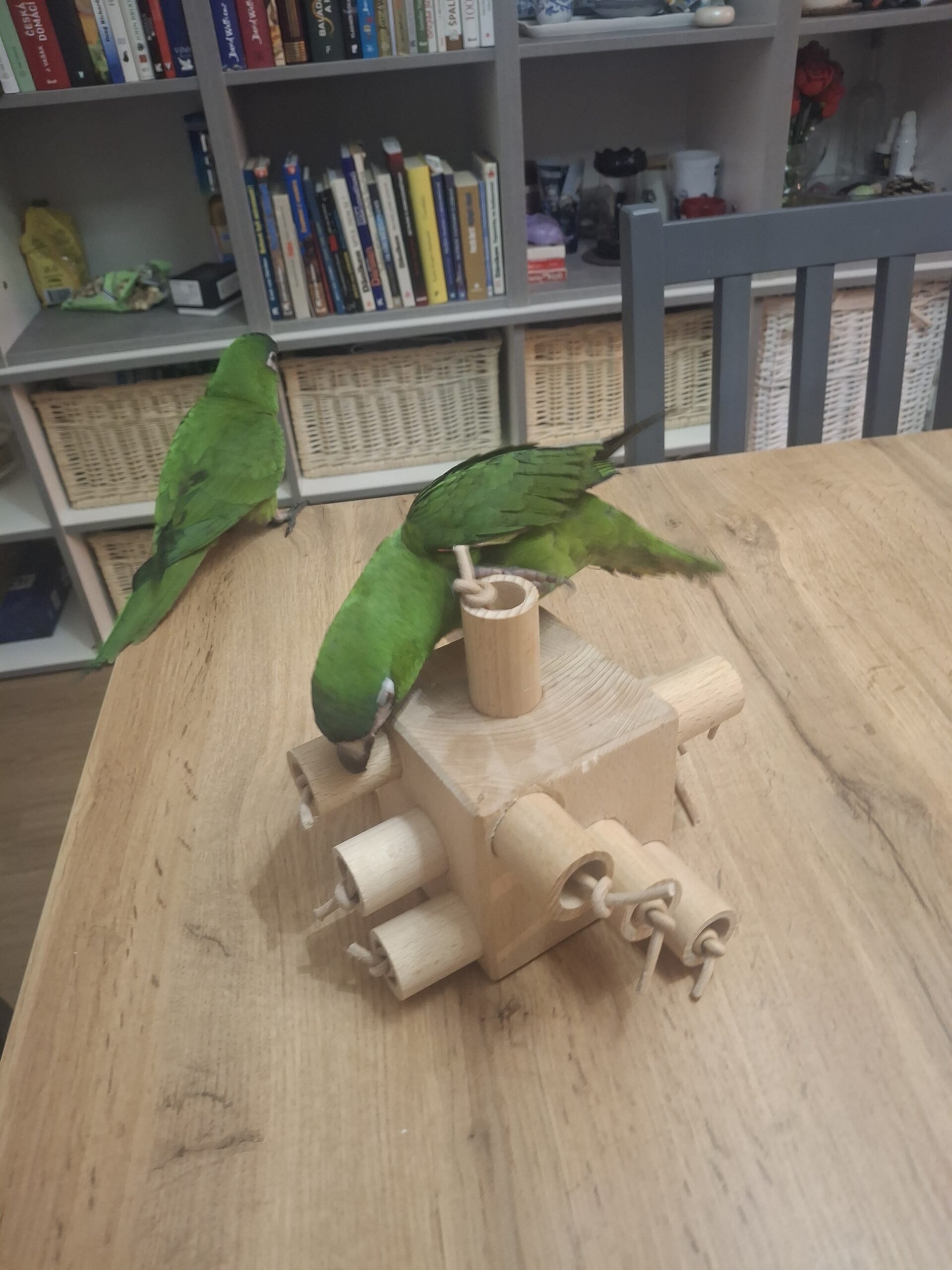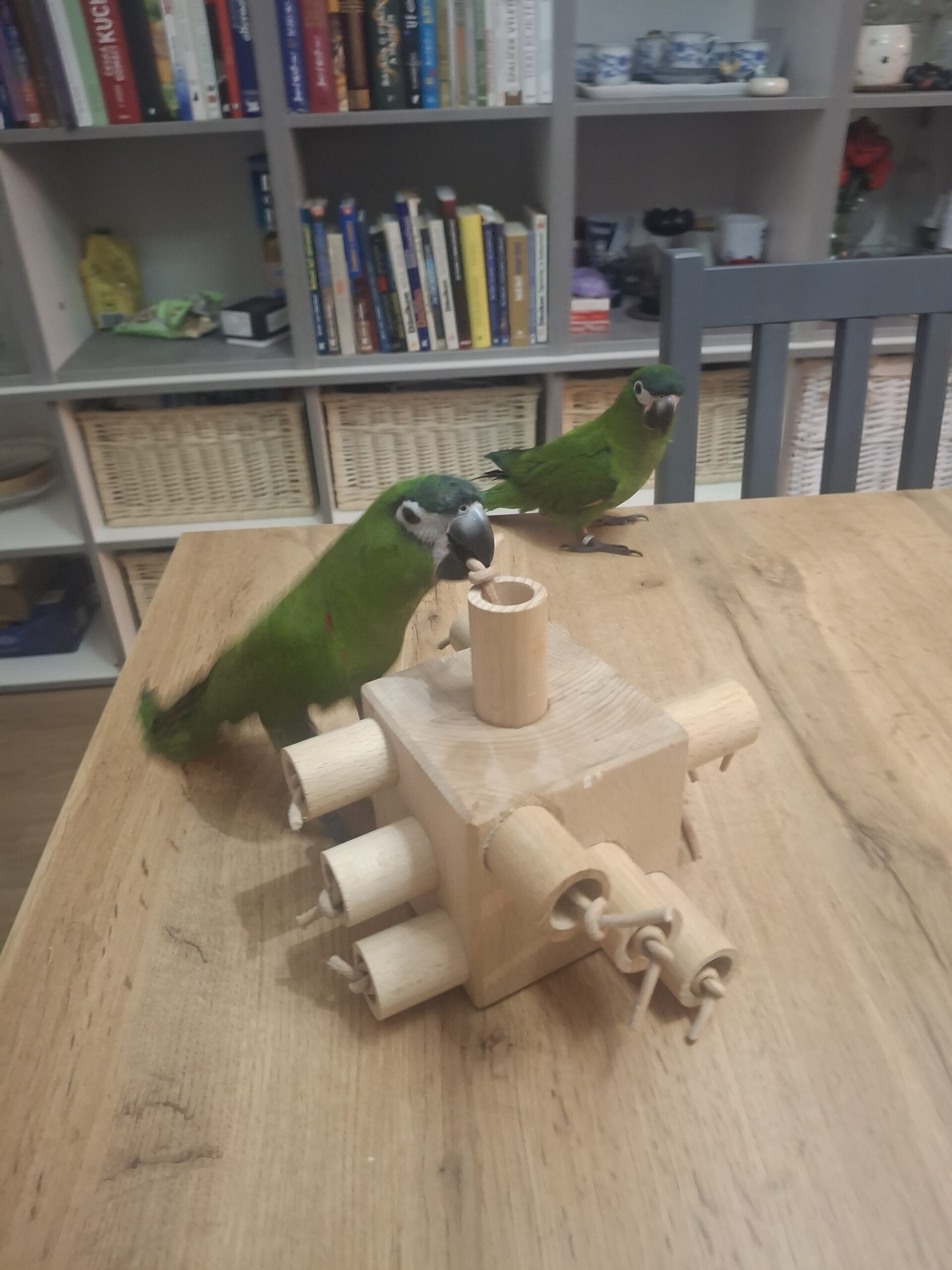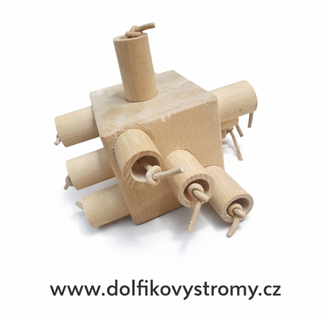 Buková kostka o délce strany 10 cm osazená dutými kolíky , které slouží k uschování potravy . Kolíky mají z vrchu osazení za které papoušek kolík snadno vytáhne, případně lze kolik doplnit kouskem provázku pro lepší uchopení. Oříšek či jinou dobrůtku lze uvnitř kolíků zafixovat kouskem papíru.
