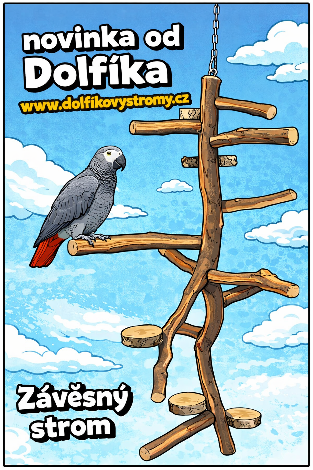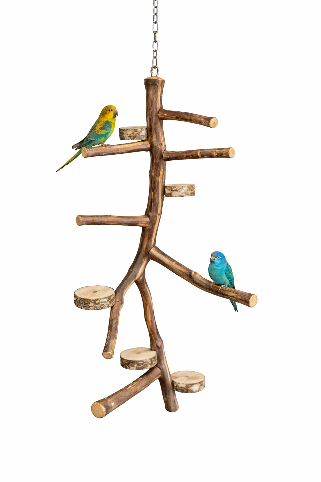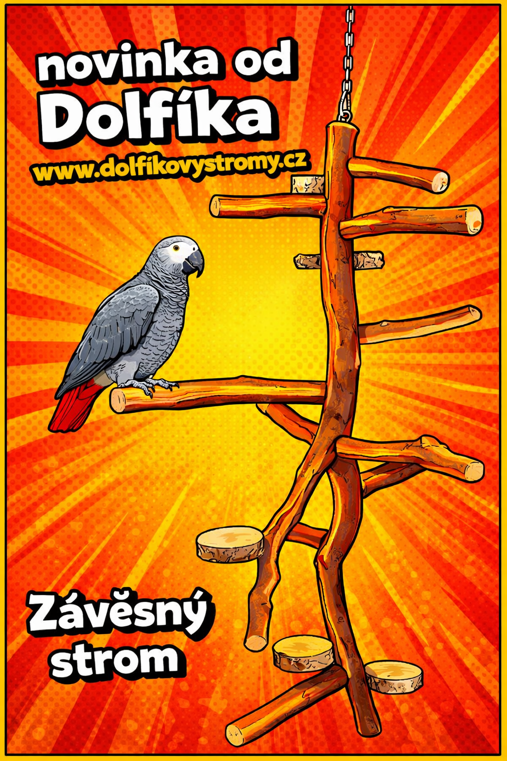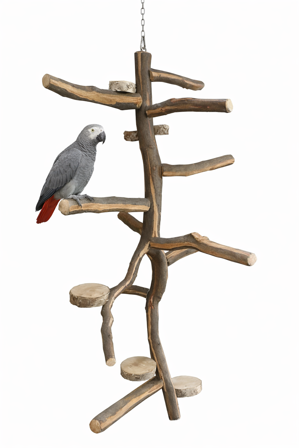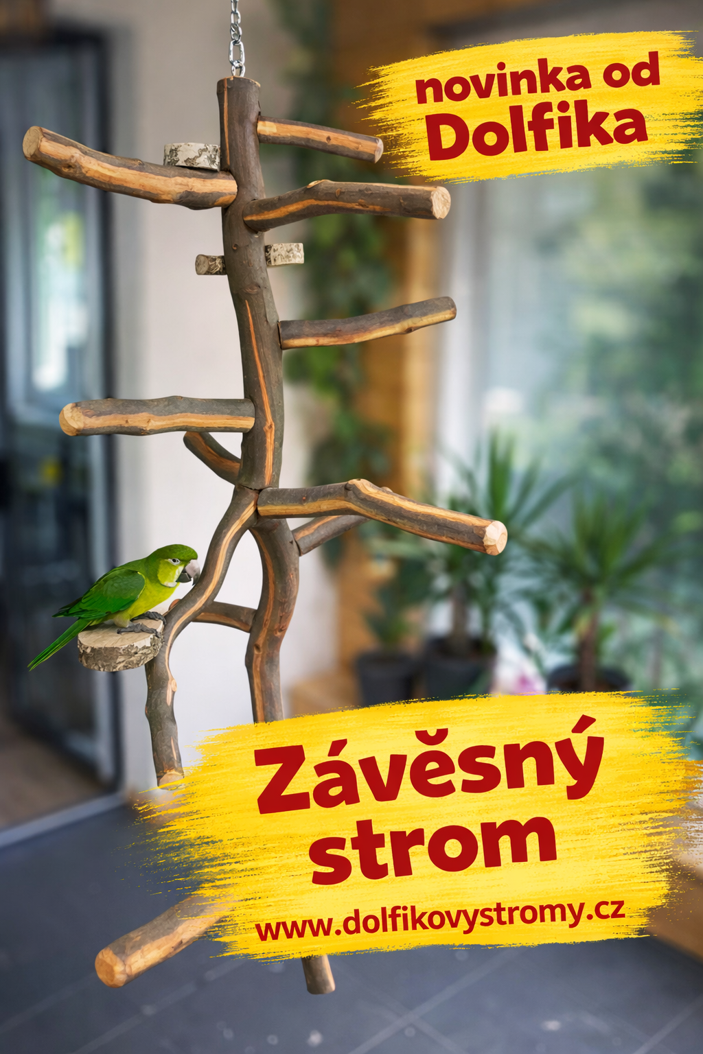 Závěsný strom pro různé druhy papoušků délka cca 100 cm až 120 cm. Stromy je osazen bidýlky, odpočívadly a na přání lze přidat misky . Vyrobeno z čerstvého buku.